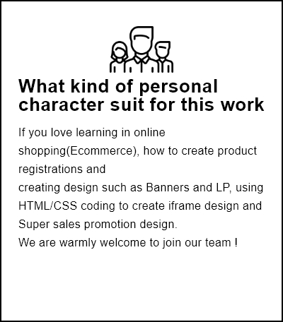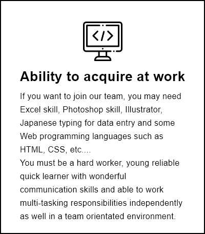 - Most of the daily tasks requested are product registrations, shipping invoice, Maintenance works, editing images/banners by using Photoshop, manage stock setting and other settings by using Manual, simple data entry and html/CSS coding for store design by creating both PC and Smartphone mode.